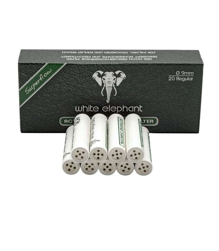 White Elephant 9 mm aktivētās ogles filtri ar keramikas ieliktņiem un “Superflow” tehnoloģiju nodrošina sausu, maigu un vieglu vilkmi.